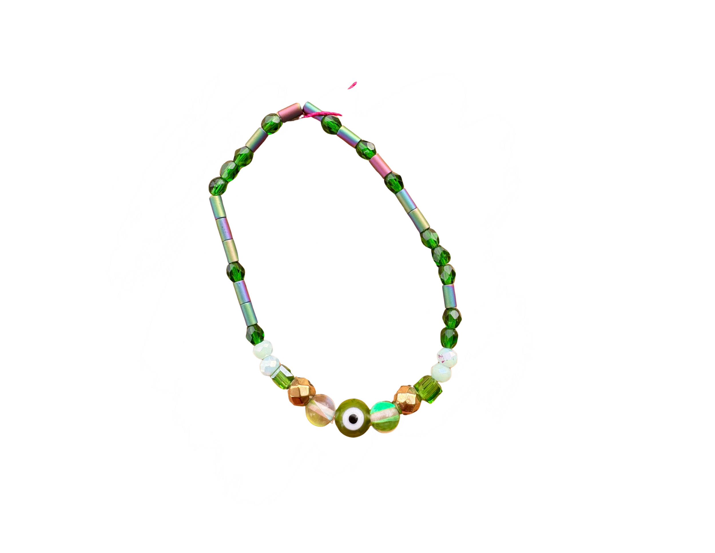 Stretch bracelet with green/multi-color glass beads. Fits adult SMALL/MED wrist.