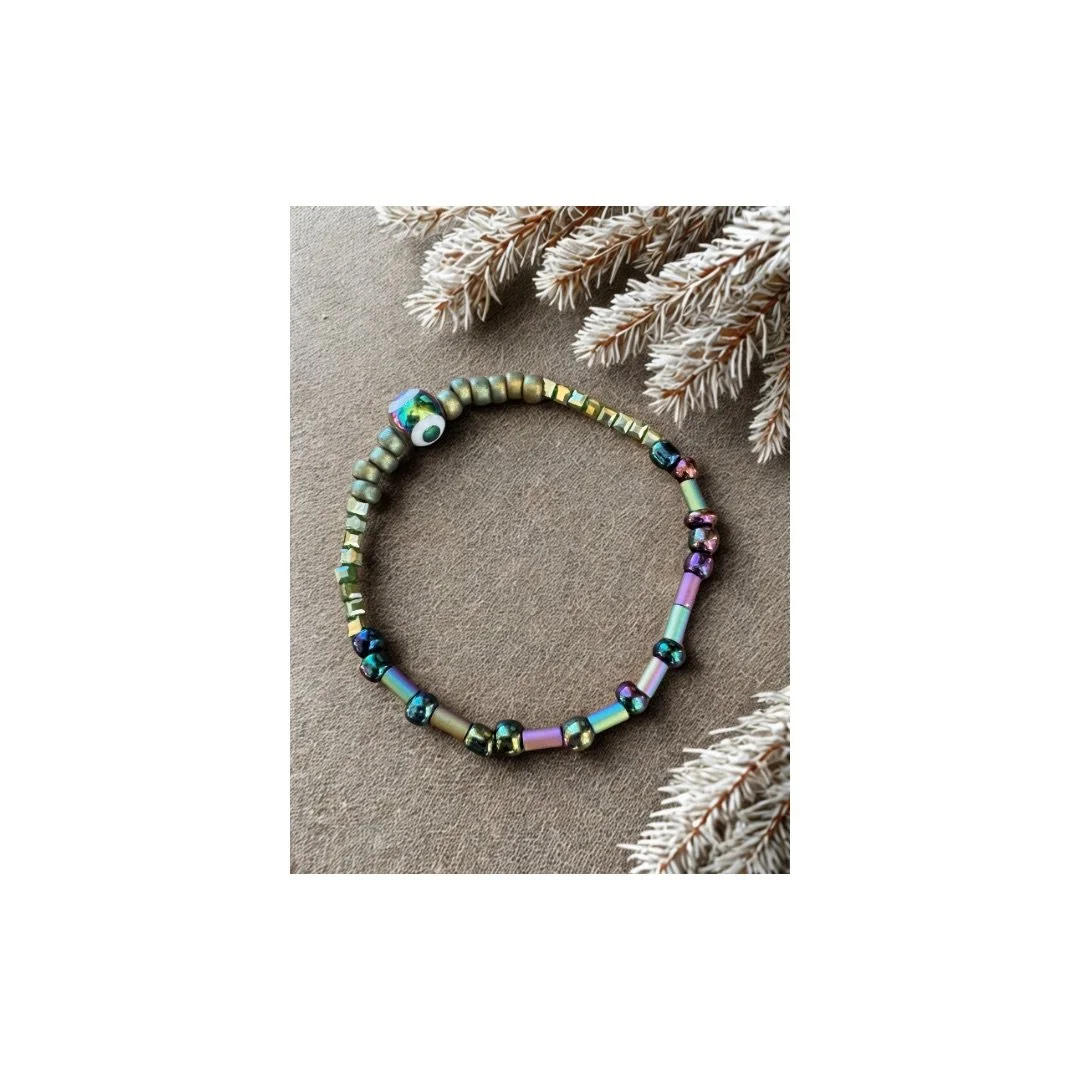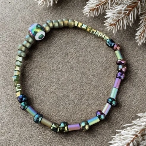 Stretch bracelet with black/iridescent glass beads and the safety of an evil eye. Fits adult medium wrist.